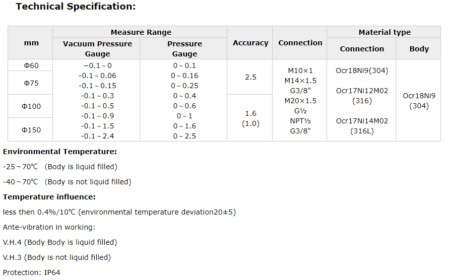 Pressure gauge that use metal spring elements as core is a locale measuring instruments, which accords with general ship technical specification. It can be used to measure pressure of gas and liquid etc. In ship and other industrial equipment.